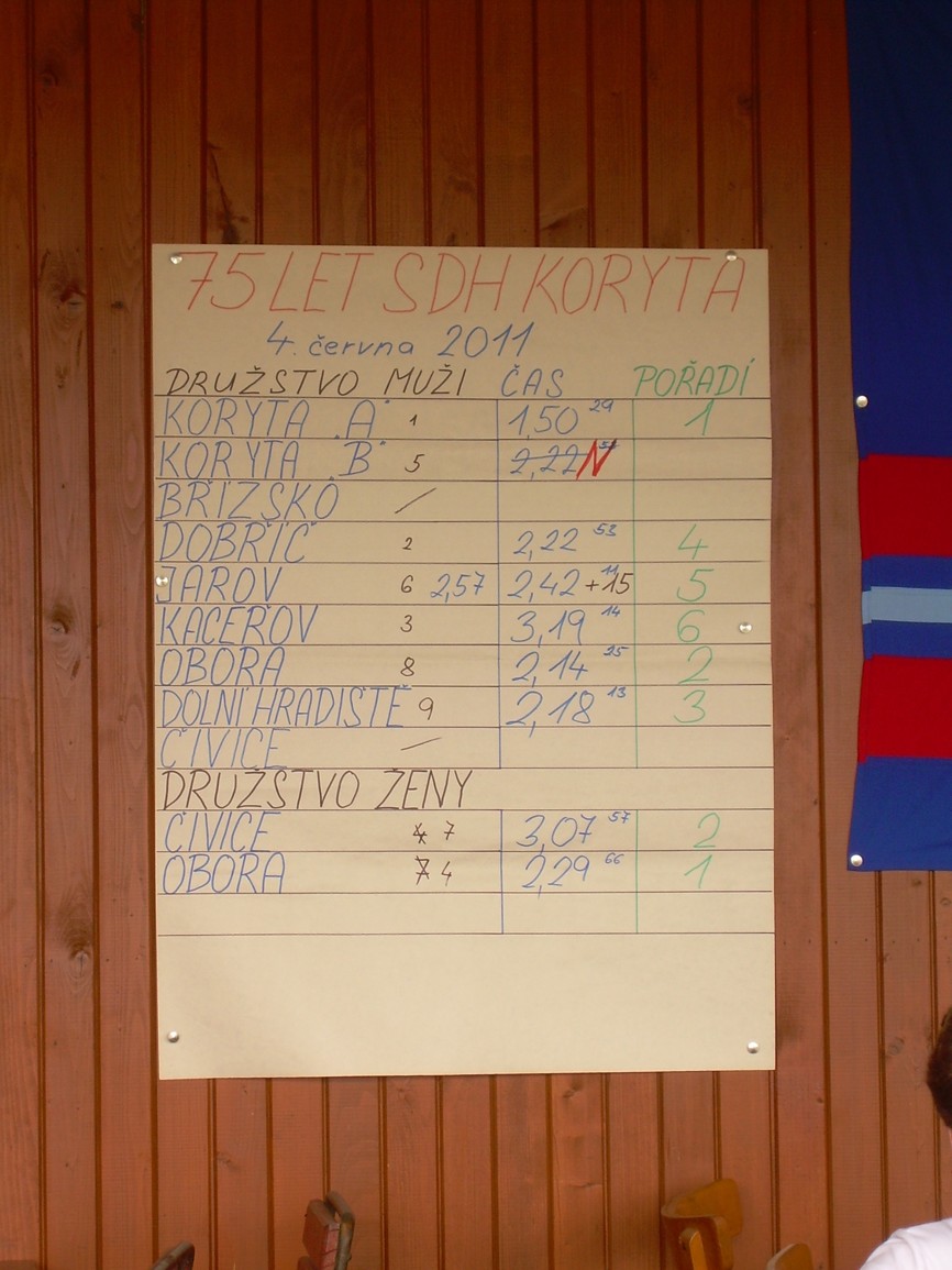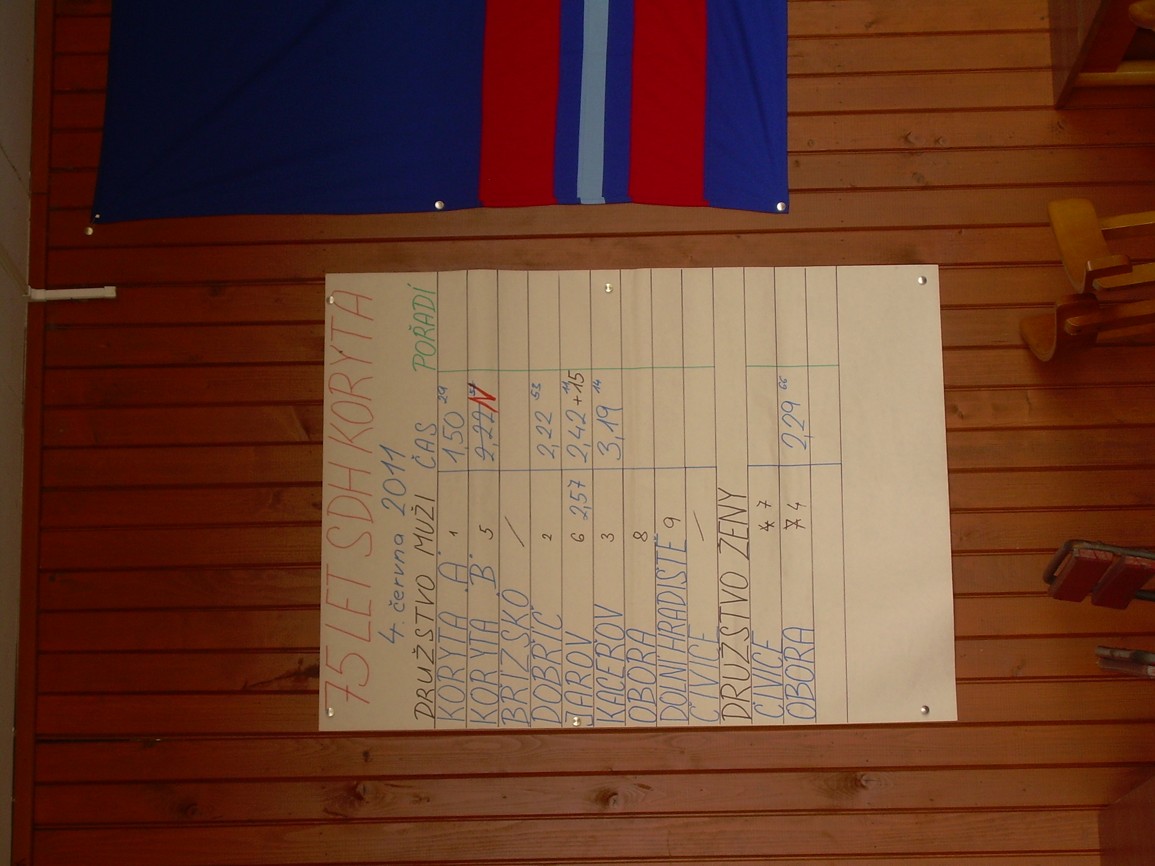 Dne 4.6.2011 se v Korytech konala hasičská soutěž při příležitosti 75. výročí SDH Koryta. Bohužel jsme se nemohli zúčastnit, protože stále čekáme na dokončení přestavby stříkačky. Zúčastnili jsme se tedy pouze jako diváci. Soutěž se skládala z netradiční štafety, po které ihned následoval požární útok. Účast týmů byla poměrně slušná, sešlo se i několik týmů žen.